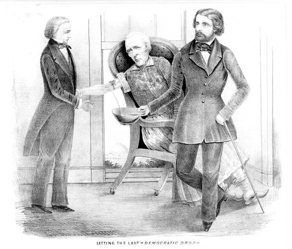 The only obvious portrait in this crudely drawn satire is that of Republican candidate John C. Fremont (right). An emaciated man (center) sits in a chair near an open window. He is apparently James Buchanan, and is dressed as an old woman, reminiscent of earlier effeminate portrayals of his Democratic predecessor Andrew Jackson in cartoons such as "New Edition of Macbeth" and "Treasury Note" (nos. 1837-7 and 1837-9). Obviously waning, he is bled by a third man, possibly either Democratic rival Stephen Douglas (unlikely), American party candidate Millard Fillmore, or Fremont running mate William L. Dayton. This man holds Buchanan's arm, having just cut his vein with a razor, and watches as blood flows into a bowl held by Fremont. The Capitol appears through the window.