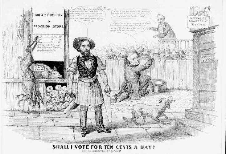 To the left is a "Cheap grocery & provision store" offering pork at ten to eighteen cents per pound, "Fine Buck" at two and a half cents, cabbages at ten to twelve and a half cents each, and other produce at equally high rates. At right is the boardinghouse of "Mrs Woodbee Late Pierce" (no doubt a disparaging reference to Democratic incumbent Franklin Pierce) offering rooms to mechanics at three dollars per week. A scrawny dog barks at the door.