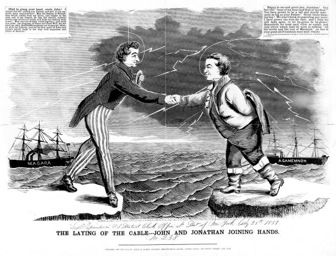 A crude but engaging picture, celebrating the goodwill between Great Britain and the United States generated by the successful completion of the Atlantic telegraph cable between Newfoundland and Valentia Bay (Ireland). Laid by the American steamer "Niagara" and British steamer "Agamemnon" (which appear in the background of the print), the cable transmitted its first message on August 17, 1858.